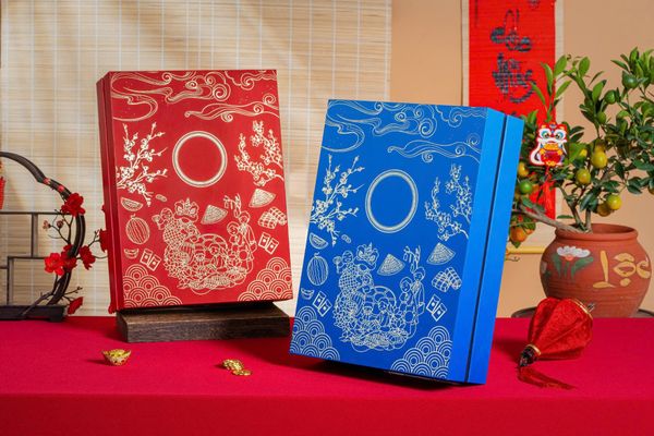 Thiết kế tinh tế với hoa văn mai vàng, sóng nước và hình ảnh đoàn viên ngày Tết được khắc họa bằng đường nét ánh kim sang trọng. Mỗi chi tiết đều gợi nhớ không khí sum vầy, ấm áp bên mâm cỗ đầu năm. Bề mặt hộp phẳng mịn, khi chạm tay cảm nhận được độ nổi nhẹ của họa tiết ép kim, thể hiện sự tỉ mỉ và đẳng cấp trong từng chi tiết.