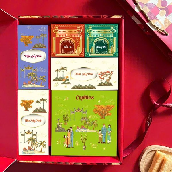 Hộp Quà Tết Đoàn Viên là biểu tượng của sự sum vầy và gắn kết yêu thương trong những ngày đầu năm mới. Lấy cảm hứng từ sắc hoa nở rộ mùa xuân, hộp mang tông đỏ trầm kết hợp ánh vàng kim tuyến, gợi lên cảm giác ấm áp, sang trọng và thịnh vượng.