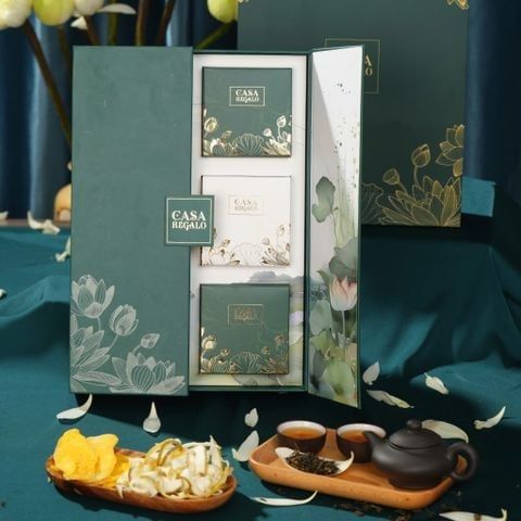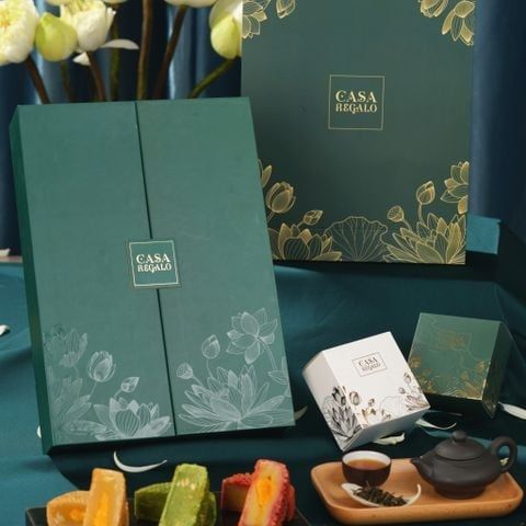 Hộp Quà Tết Hoa Sen là biểu tượng của sự thanh khiết, tinh tế và may mắn – như đóa sen vươn mình giữa mùa xuân mới. Lấy cảm hứng từ vẻ đẹp thuần Việt của hoa sen, hộp mang tông xanh ngọc trang nhã kết hợp họa tiết sen ánh vàng, gợi cảm giác an yên và thịnh vượng.