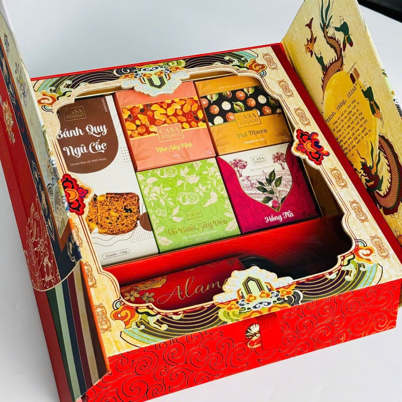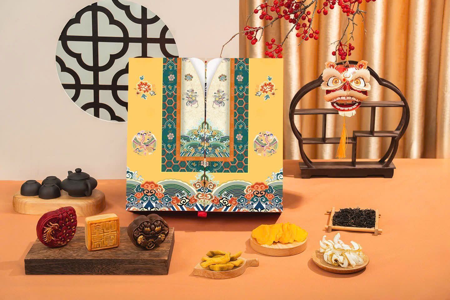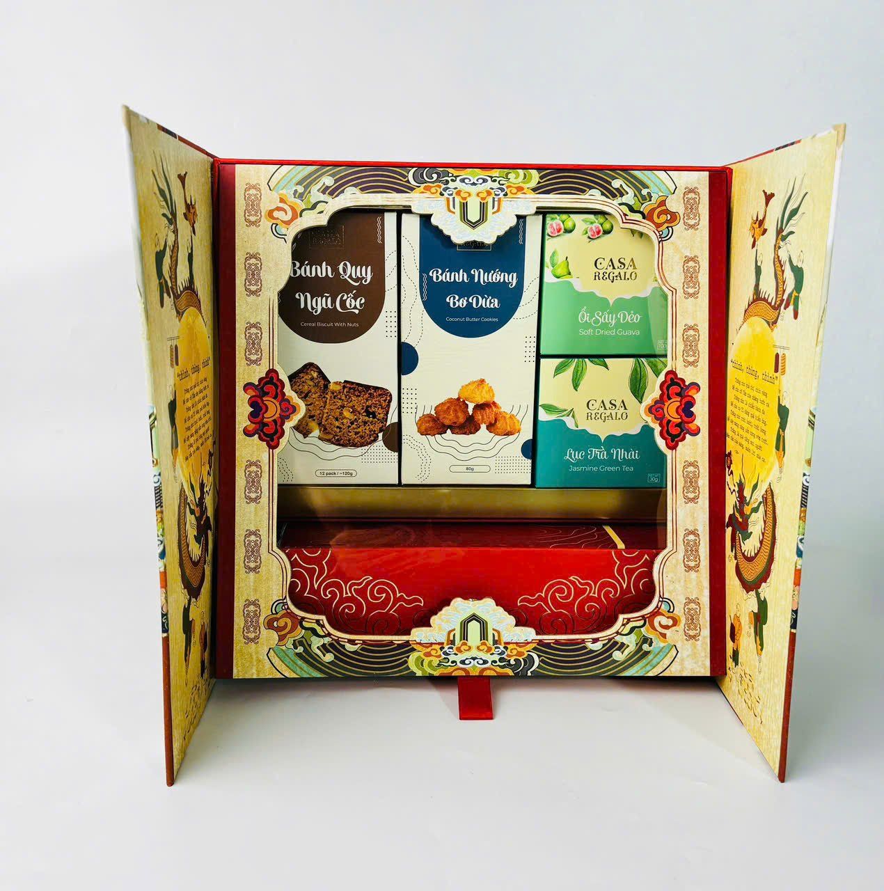 Bề mặt hộp được chế tác trên chất liệu giấy cao cấp, điểm xuyết hoa văn long – phượng, mây lành cùng đường nét ép kim ánh vàng rực rỡ, mang lại cảm giác sang trọng và quyền quý. Thiết kế hộp mở đôi mô phỏng dáng áo Nhật Bình, khi mở ra hé lộ không gian bên trong được sắp đặt chỉn chu, với các ngăn quà tinh tế, phối họa tiết cung đình và gam màu hài hòa – thể hiện sự trân trọng trong từng món quà gửi trao.
