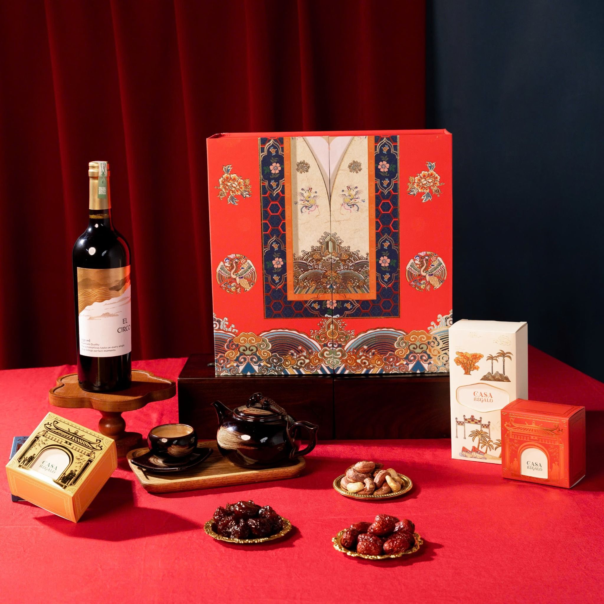Bề mặt hộp được chế tác trên chất liệu giấy cao cấp, điểm xuyết hoa văn long – phượng, mây lành cùng đường nét ép kim ánh vàng rực rỡ, mang lại cảm giác sang trọng và quyền quý. Thiết kế hộp mở đôi mô phỏng dáng áo Nhật Bình, khi mở ra hé lộ không gian bên trong được sắp đặt chỉn chu, với các ngăn quà tinh tế, phối họa tiết cung đình và gam màu hài hòa – thể hiện sự trân trọng trong từng món quà gửi trao.