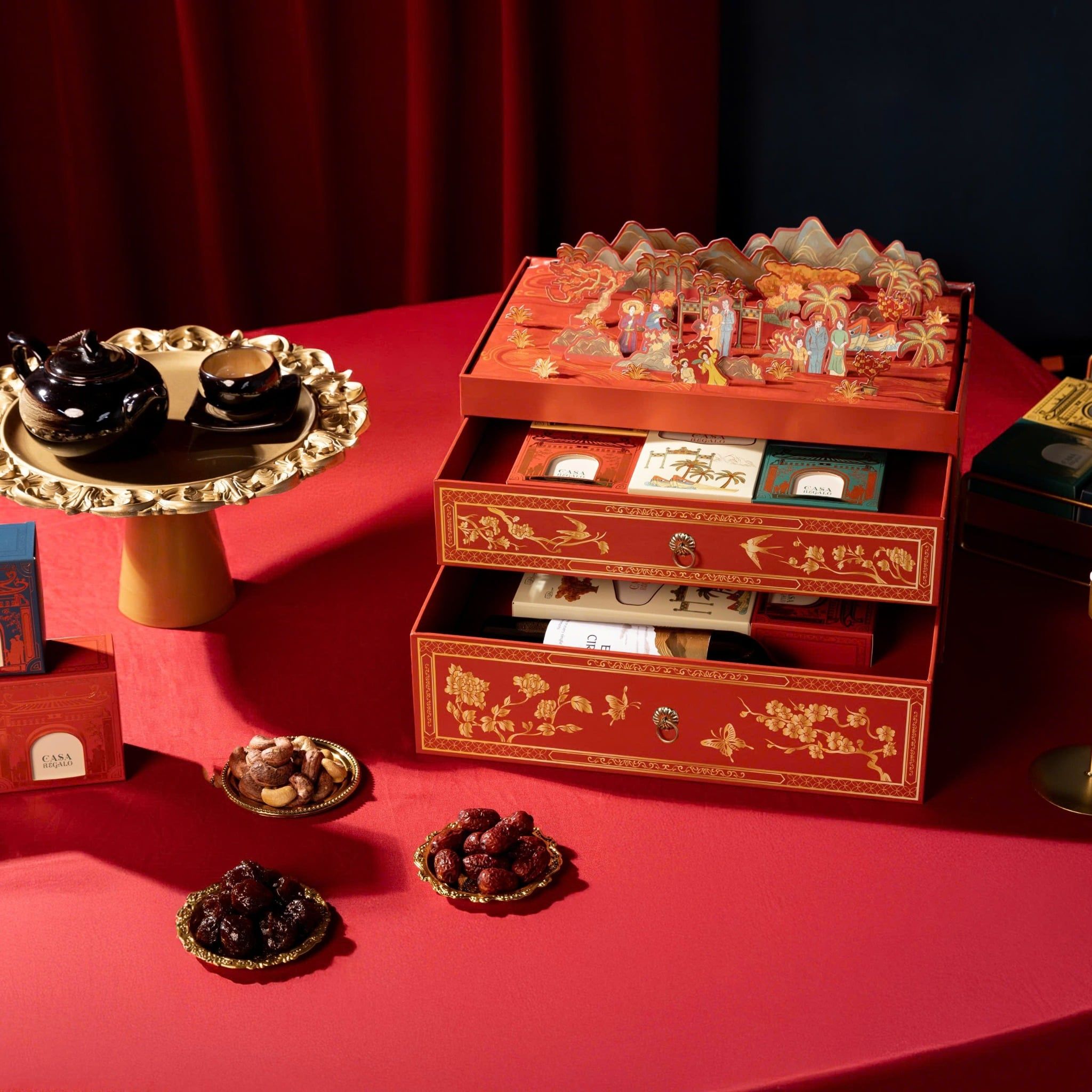 Hộp được chế tác từ giấy cao cấp, gia công ép kim tinh xảo trên từng họa tiết chim – hoa – bướm – mai đào, tạo độ nổi sang trọng và ánh kim mềm mại. Thiết kế dạng hai ngăn kéo giúp sắp xếp quà tặng gọn gàng, tiện dụng, đồng thời làm tăng giá trị thẩm mỹ.