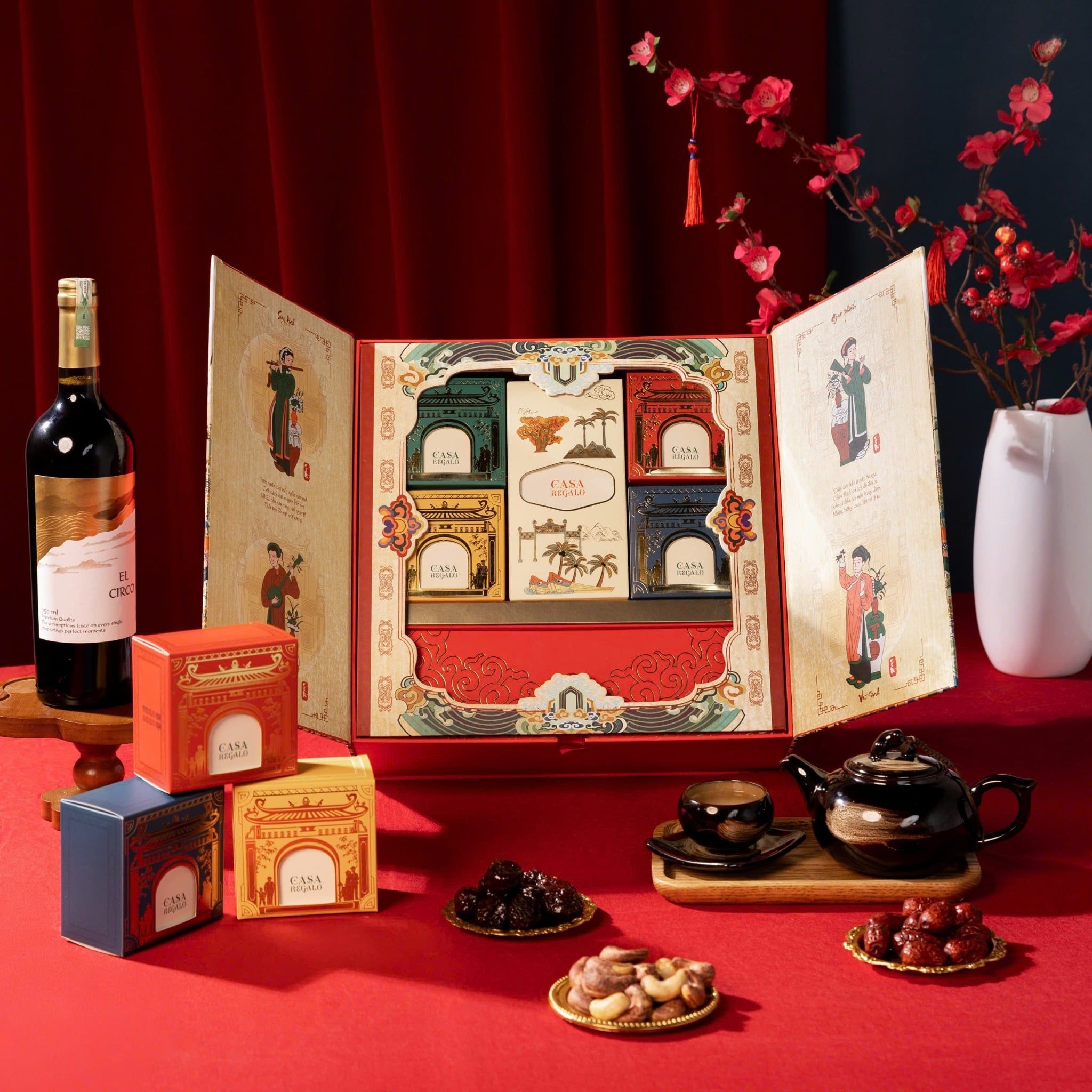 Hộp quà Tết Vườn Xuân là một thiết kế mang đậm hơi thở lễ hội truyền thống, tái hiện sinh động không khí mùa xuân Việt Nam qua nghệ thuật minh họa đầy tinh tế. Trên bề mặt hộp là một “bức tranh Vườn Xuân” thu nhỏ, nơi những nhân vật trong trang phục cổ truyền đang du xuân, thưởng hoa, trò chuyện giữa khung cảnh cây cối, núi non và sắc xuân rực rỡ.